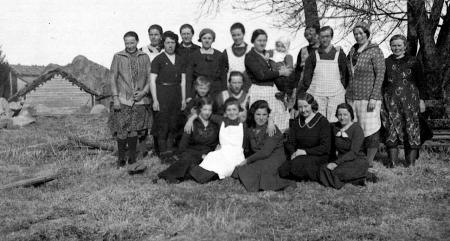 Överst fr.v: Matilda Burman (Maalaks-Albärtas Tilda), Ida Burman (Maalaks Iida), Senny Nygård (Frekkas Senni), Matilda Nygård (Maalaks-Hannesas Tilda), Elna Frants (Lillsto Elna), Anna Bergendahl (Maalaks Anna), Irene Bergendahl (Maalaks Rieni), med dottern Adele i famnen, Anna Holm (Laksis Anna), Matilda Bertholm (DaLi Tilda), Hellen Burman (Maalaks Hellen), Elisabeth Burman (Skata Betti), okänd pojke, Hilma Eriksson (Laksis Hilma), Saga Burman (Bekkmans Saaga), Aili Svahn ?? Sylvia Mörk. Alvina Frants, Okänd.