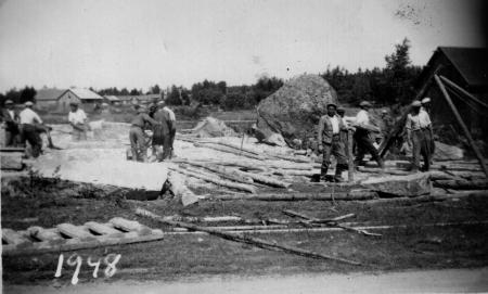 Platsen där samlingshuset står heter Kvarnhagen (Kväänhagan). Förrän huset byggdes fanns stora stenar på tomten, på denna bild kan vi se en av dem. För att komma upp på flera av stenarna behövdes stege. Där stenen på denna bild finns står vedlidret, som byggdes 1956. Det hus som syns till höger är mangelhuset, byggt 1946. På bilden ser man "Liisos Aagostas" hus i bakgrunden, där Evald och Astrid Frants bodde. Det huset ägs idag av Thomas Österberg.