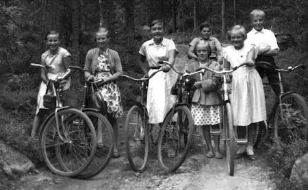 Fr.v: Iris Nygård (g. Håkans), Gun-Maj Hedqvist g. (Häggman), Britta Frantz (g. Svarvar), Birgitta Krus (g. Fochsell), Ann-Marie Mörk (g. Lundström), Rune Frants och bakom Harry Burman.
