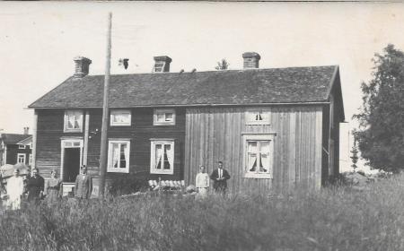 Personerna framför huset fr.v. Signe Kock, Elisabet Burman, Edit Burman (Nygård), Albert Burman, Ida Norrgård (Burman) Anders Abraham Burman.