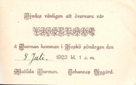 Bröllopsinbjudan Johannes o. Matilda Nygård