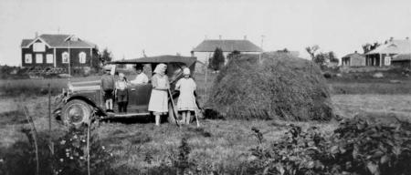 Fredrik Werner Jakobsson kör hö i Kvevlax. I bakgrunden syns Kvevlax Folkskola t.v. och slöjdskolan t.h.