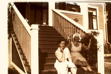 Matilda Burman t.h. arbetade som träd-gårdsskötare i Norrminne åt professor J.L . Lindström. Foto från början av 1950-talet. Den andra kvinnan heter Martta (efternamn okänt) och hon skötte hushållet.