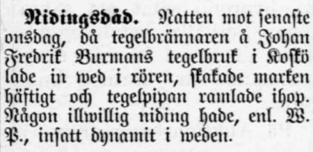 Nidingsdåd. Natten mot senaste onsdag, då tegelbrännaren å Johan Fredrik Burmans tegelbruk i Koskö lade in ved i rören, skakade marken häftigt och tegelpipan ramlade ihop. Någon illvillig niding hade isatt dynamit i rören.