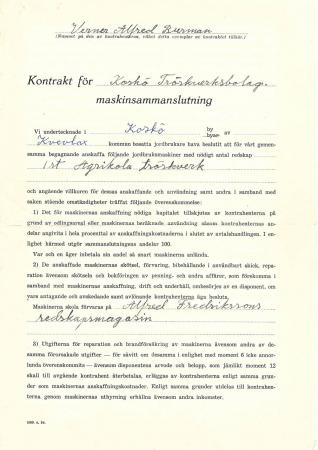 Jordbruk Koskö tröskverksbolag kontrakt sid 1