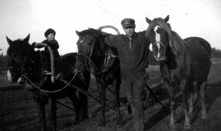 Tre hästar, samt Arvid Fant och dottern Oline.