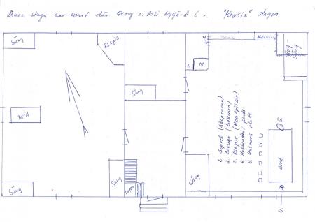 Ritning gjord av Alf Burman på basis av vad Evald Frants förklarat. Enligt honom såg bondstugan vid "Kruusis" så här. Hus nr 30 i Kosköboken.