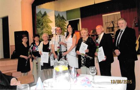 Fr.v: Lisen Jåfs (Snickars), Alice Sandelin (Burman), Aili Nygård (Eriksson), Bengt Burman, Susanne Granholm (Sandelin), Elli Rabb (Burman), Almer Tast, Alf Burman.