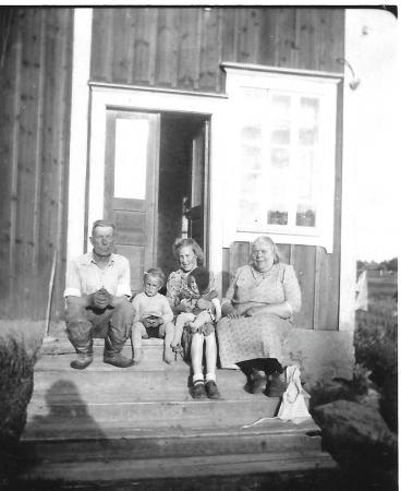 Foto taget på trappan till hus nr.107 i Kosköboken. På trappan: Albert Krus, Kaj Krus, Vera Krus, Carita Krus, Johanna Syring.