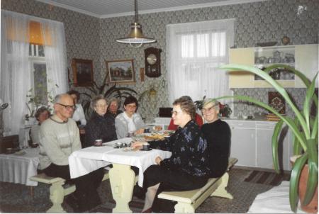 Runt bordet fr.v: Sven Jakobsson, Astrid Frants, Gun-Maj Hästbacka. Till höger Vera Krus och Ellen Näsman.